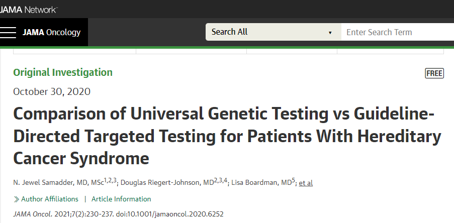 梅奥医学中心研究团队曾对2984名确诊的癌症患者进行过研究,发现超过八分之一的癌症患者具有与癌症相关的可遗传基因突变。他们的子女、兄弟姐妹及其他亲人也可能携带有这些致癌基因突变。其中包含的主要癌症类型有:乳腺癌、结直肠癌、肺癌、卵巢癌、胰腺癌、膀胱癌、前列腺癌和子宫内膜癌等。这项研究以“Comparison of Universal Genetic Testing vs Guideline-Directed Targeted Testing for Patients With Hereditary Cancer Syndrome”为题发表在JAMA Oncology上。